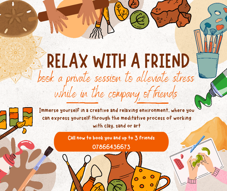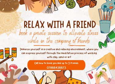 These are private sessions you can book for you and your close friends to be able to enjoy some time to chat and create. They are flexible sessions and can involve painting, clay, sand and/ or meditation- your choice.
